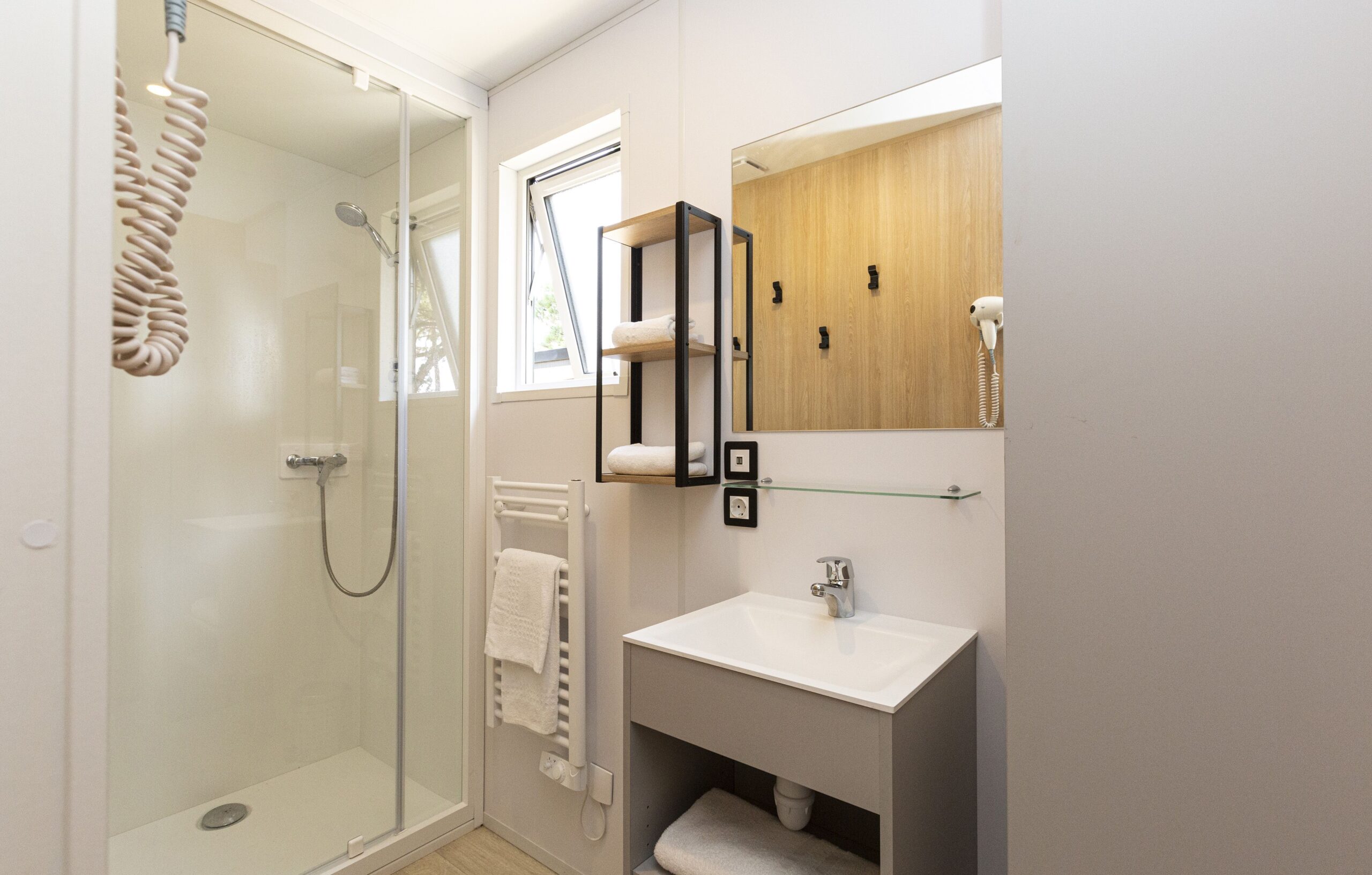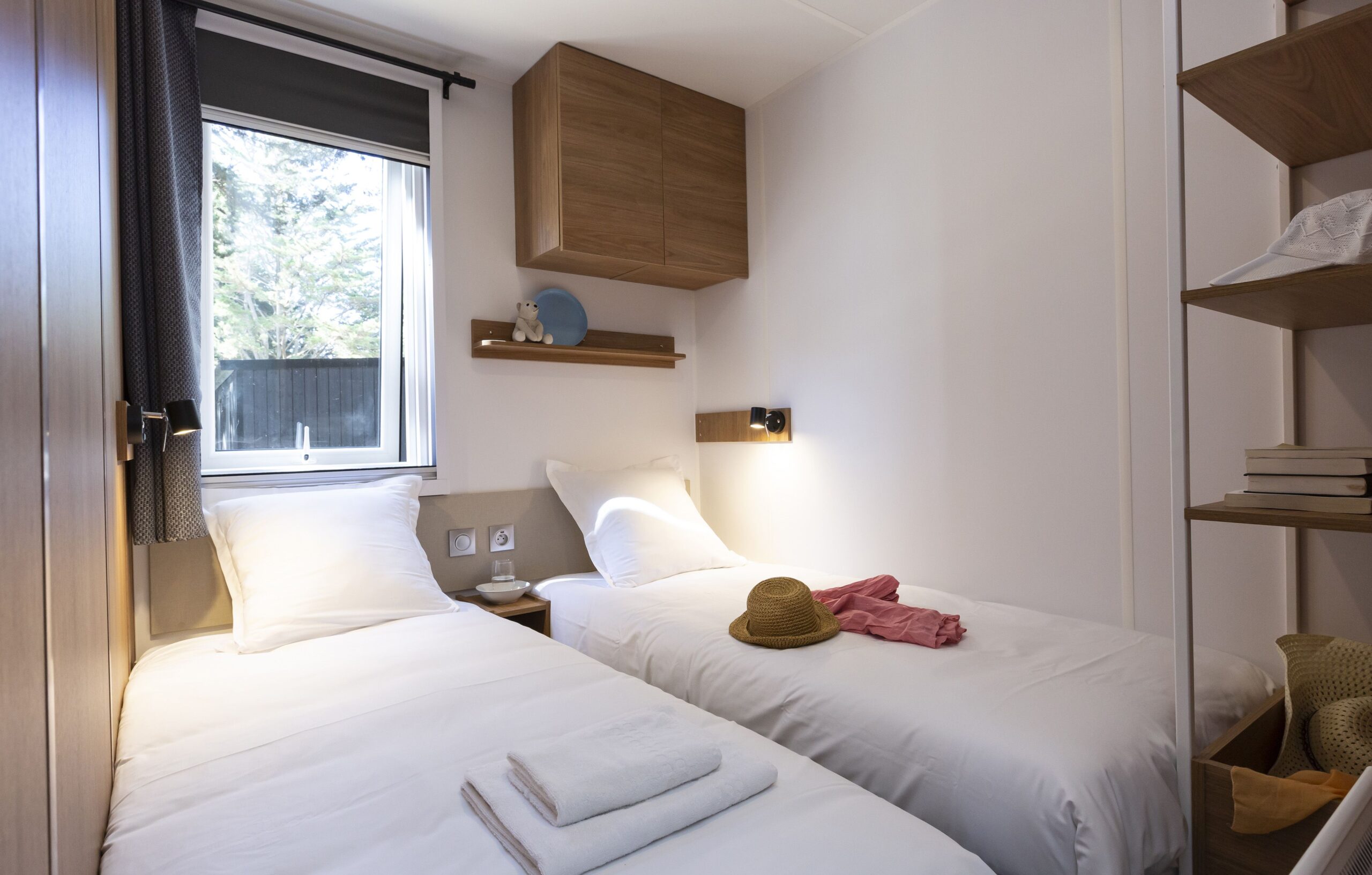 Mobil-Home Premium 30m² (2 chambres – 4 pers.) + terrasse + TV + draps et serviettes + CLIM